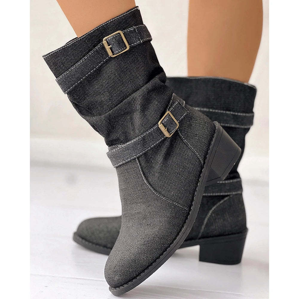 مصنوعة من الدنيم المبلل الناعم، تتميز هذه الأحذية المتوسطة الارتفاع بقصة واسعة ومريحة، بالإضافة إلى أحزمة مزدوجة مستوحاة من الطراز القديم لمظهر منظم وطبيعي.