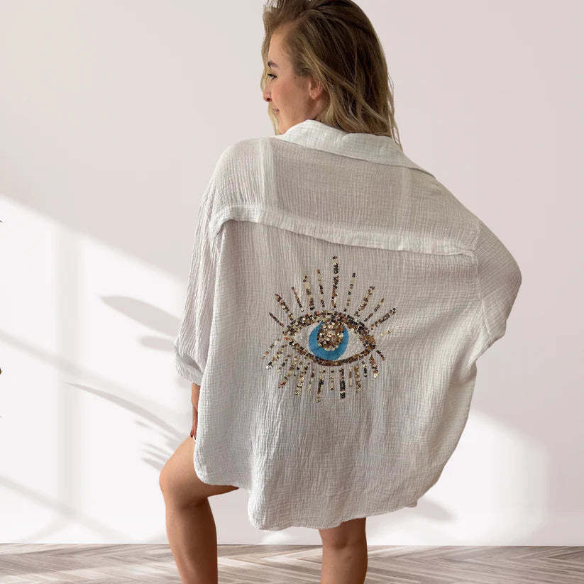 يتميز بنمط عين مرصع بالخرز على الظهر، يوفر هذا القميص لمسة من البريق والأصالة التي لن تجدها في أي مكان آخر.