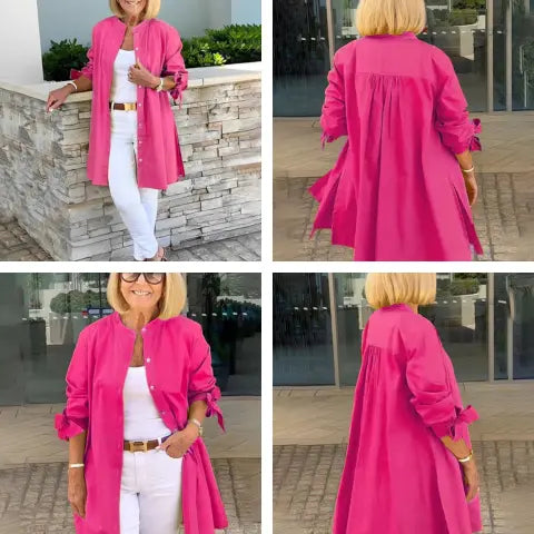 تضفي هذه القميص ذو الأكمام الطويلة المصنوع من القطن لمسة من التألق على خزانة ملابسك. قصته الواسعة والمغرية وتفاصيله الأنيقة، مثل الطيات في الظهر والأربطة الجميلة على الأكمام، تجعله قطعة أساسية. مثالي لإضفاء الحيوية على مظهرك اليومي.